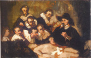 原畫「突爾普醫生的解剖學課程」中呈現的是一幕人體解剖示範,畫面中,十七世紀時阿姆斯特丹大名鼎鼎的突爾普醫生正在向他的七位助手講解左臂肌肉的功能。躺在手術台上的是已處決的犯人。沒有人真正面向觀眾,畫面卻充滿向心力,強烈的明暗對比又增加了戲劇性的效果。馬內用粗獷有力的筆觸,將林布蘭特的畫中人物簡潔地表達出來,但若與原畫比較,又不失細膩地傳達了每個細節、人物的角度與光線效果,由此可見當時年紀尚輕的馬內,對於繪畫技巧的精準掌握度。後來,馬內就將這幅畫贈送給他的私人醫生了。