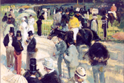 這幅《馬場一隅》,描繪十九世紀相當受歡迎的賽馬活動景象。西方的賽馬傳統可以追溯至古希臘的奧林匹克運動會中的騎馬競技,而現代賽馬的型態則是起源於英格蘭,而後再普及到歐洲各地,並且由一種貴族的活動逐漸轉變成社會各階層所喜愛的社交娛樂。夏荷列的此幅畫作,選擇比賽之前騎士們帶著馬匹準備過磅檢查的景象;其畫面的人潮熱絡,光線溫暖又和煦。透過畫家鮮明有力的筆觸, 此畫傳神地表達出賽前一股歡樂的活躍氣氛。