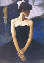 區楚堅擅長風景和肖像主題,他高度寫實的畫作裡經常蘊含有一份單純含蓄的生命之美。《黑天鵝》一作選擇了舞台上的一個剎那,以身著黑色舞衣頭部側向左下方的陰鬱身影,詮釋出別於光鮮亮麗舞台的一幕;而區楚堅那含蓄筆法中帶著跳躍感的筆觸,以及幽沉與明柔交互使用的色彩,不但刻畫出舞者的優美形象,其簡單的構圖與刻意平面化的空間處理,尤其突顯出主角獨特的心理狀態,和營造出一股虛實相生的神秘美感。完全呼應畫家所提及的「剛柔相濟」的美學主張。