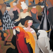 《假面舞會》是王向明近年新創作的「面具」系列之一。在這件作品中王向明將裝扮華麗的一群女人和色彩艷麗的巨大鸚鵡以一種不合常理的方式安排在具有現代感的空間中,其風格明快的畫面裡卻是一張張戴著面具而沒有表情的臉孔。王向明拋卻了生活的外在情緒,直接以心靈與藝術對話,在看似一場由人類與鳥類共構的狂歡世界裡,探索著現代生活背後的精神秘密。王向明這類帶著魔幻寫實風的作品也比較單純,它們雖然充滿神秘的遐想,卻少有如亨利•盧梭 (Henri Rousseau, 1844-1910)的作品一般的詩意企圖。他畫面中的獨特巨鳥與華麗女子究竟希望抒發與隱喻些什麼?他的畫友俞曉夫對其畫作的觀察:「它們是單純的象微,也是寓言、詭祕或不可言說的象微。在明媚繁華的城市樓群中,虛構出一種鏡框裡的叢林與棲居的鳥,以此逃避日新月異的時尚與信息的闖入…」或許可以作為我們欣賞王向明此類作品的另一個參考。