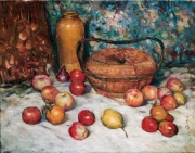 這幅靜物畫雖然簡單,不過畫家以充滿中式情調的籃子、水甕,搭配印象派畫作中經常描繪的蘋果與西洋梨的構圖,則將他留學法國時所受到的影響和畢生專注於油畫民族化的企圖展露無疑。此畫的油彩相當厚實,筆觸活潑明快,其細膩豐富的色彩變化尤其將桌上的水果的香氣與口感生動的展現,讓觀者彷彿從畫家飽和的油彩和靈活的運筆中呼吸到新鮮水果散發出的自然香氣,相當地令人陶醉。而畫面後方背景中所採用的奔放筆觸和鮮麗色彩,則更為強化這幅作品中的舒暢情感和明快節奏,是胡善餘成功融會中西美學所繪成的一幅佳作。