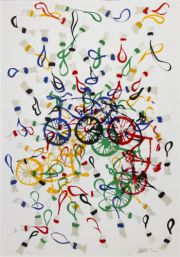 阿曼也擅長在平面作品上用顏料去發展出豐富的造型語彙,一種由線條、色彩與材質本身所交織出的生命力,以及存在於生活週遭卻不易被發現的趣味。在中環美術館收藏的《奧運百年紀念版畫集》裡,阿曼為一九九二年巴塞隆納奧運所創作的作品,乃以他平常作畫時經常使用的顏料管為符號,輔以自行車的圖像穿插於畫面中央,成功將個人的藝術語彙與奧運的自由競賽精神,在藍、綠、黃、紅、黑與灰的色彩配置裡,活潑的呈現。