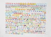 一九九二年白南準受邀為巴塞隆納奧運所做的這件紀念版畫,雖然不是運用他一向慣用的科技媒體,但畫面中不斷重複的元素仍與藝術家的思想和生活密不可分,他追問著時空問題的時鐘、飛機與汽船,和音樂有關的鋼琴與音符,象徵自然界的各種動物,以及一些和國家或政治時事相關的文字,一方面突顯出畫家跨地域和文化的創作背景,一方面則展露他對人文議題的持續關懷。