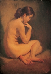 一九五七年,劉國樞以他的女兒作為模特兒創作出這件裸女像《思》。畫中的年輕少女側向觀者而坐,她的頭髮盤結於顱後,頭部朝下以右手托住,整個身體形成一種柔美內縮的圓弧線條,讓此清晰單純的構圖十足地呈現出東方女子的含蓄之美。而透過少女凝望地上的眼神與沉靜面容,以及畫家近乎單色調的色彩處理和由前方所投射下來的光影效果,這幅畫不僅柔和地呈現出一位內心縈繞著某種思緒的少女,還成功地凝結了時空,將人物的「靜」與「思」完全地烘托出來,讓觀者在欣賞此畫的時候不知不覺地走入了畫家所營造與冀望傳達的凝想世界。