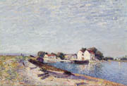 亞弗列德•希斯里(1839-1899)為英國畫家,長期居住於法國,所畫的風景主要是取材於巴黎郊區的鄉野。希斯里受巴比松畫派畫家柯洛(1796-1875)的影響甚深,重視畫中景物的濃厚詩意與情感。一八七三年後加入印象派的行列,與克勞德•莫內、雷諾瓦等人熟識。一八八三年夏天,移居於聖馬梅斯,這是塞納河(Seine)與盧安河(Loing)合流處附近的村落。一八八五年至一八八六年間,他四處去發掘他所喜愛的繪畫題材,追求景物沐浴在陽光下的自然形態,許多優秀的作品都是畫於這一時期,形成一系列景觀相近的畫作。畫中主要的景物如河堤、紅色屋頂、水閘與停船場等,都具有當地的地方特色。